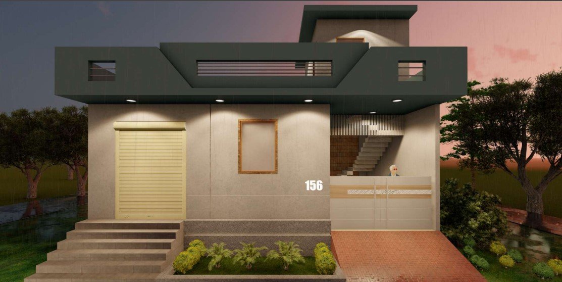Discover the unique charm of our one story building elevation, a harmonious blend of creativity and functionality. MS bars run seamlessly from floor to floor, outlining a circular cut that frames a flourishing tree—a living, breathing centerpiece. At the heart of the facade stands a box frame, adorned with a captivating mix of bricks, stones, and a glass rail, creating a visually arresting focal point.