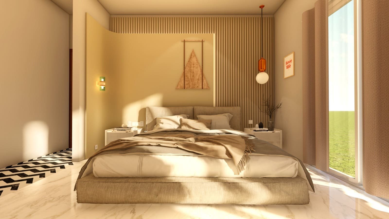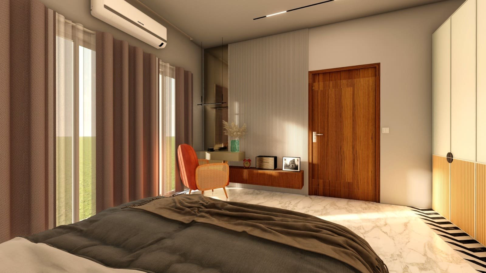 The flooring, a blend of wooden and Italian stone, radiates sophistication. Minimalist-inspired false ceilings and a hanging light fixture add an artistic touch, while glass wardrobes with translucent panels create an airy ambiance. The color palette, a seamless mix of soothing beige and rich wood textures, sets the tone for a tranquil yet contemporary retreat. Welcome to a space where modernity meets refined design.