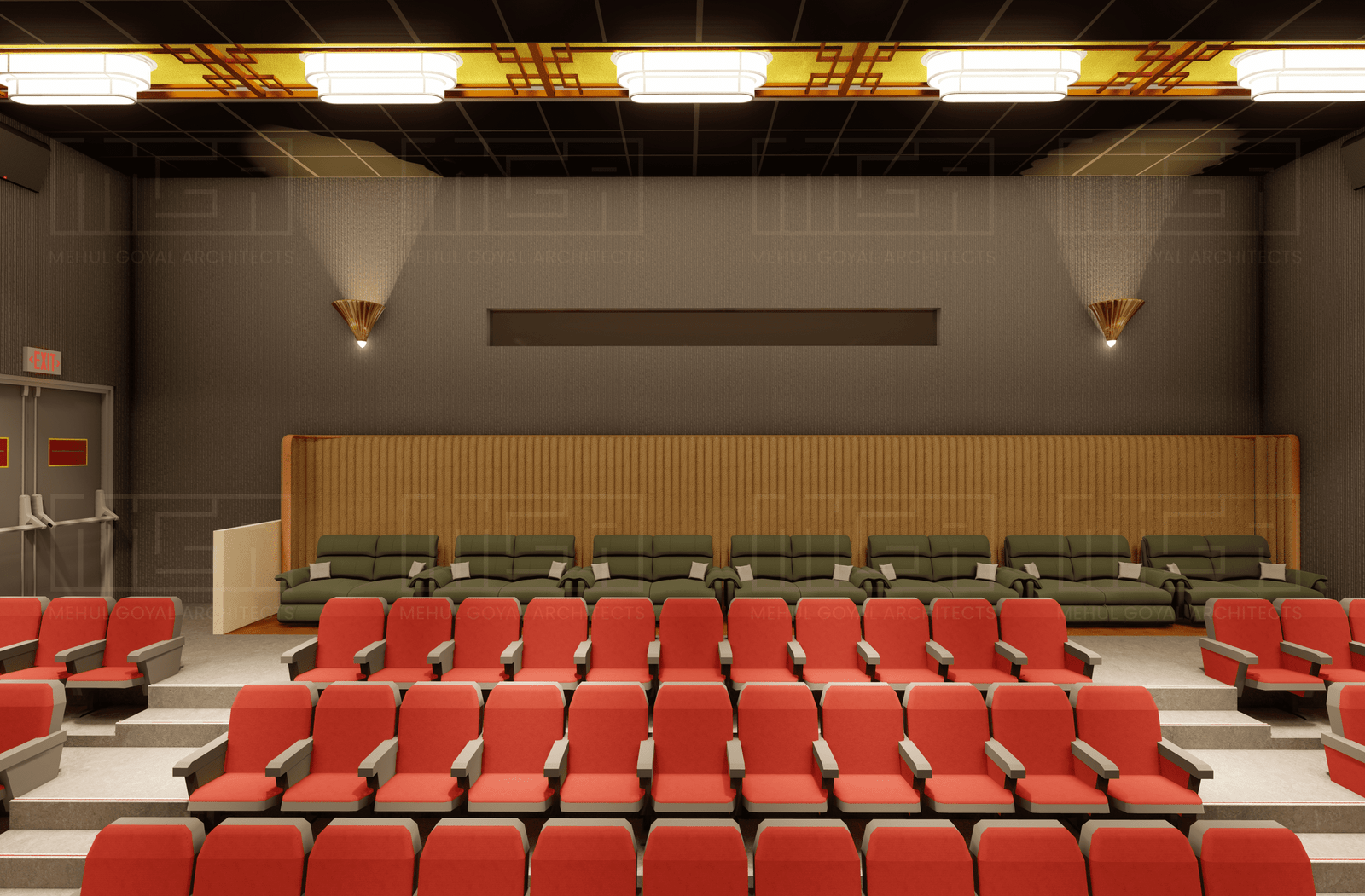 Step into the epitome of cinematic indulgence at "LuxeScreen Cinemas." Our theater interior is a symphony of sophistication and luxury, enveloped in a palette of refined grey shades. Immerse yourself in the opulent ambiance enhanced by linear dim lights, meticulously designed for optimal theater lighting. As you recline in plush seating, the soothing glow and carefully curated surroundings create an atmosphere of unparalleled comfort.