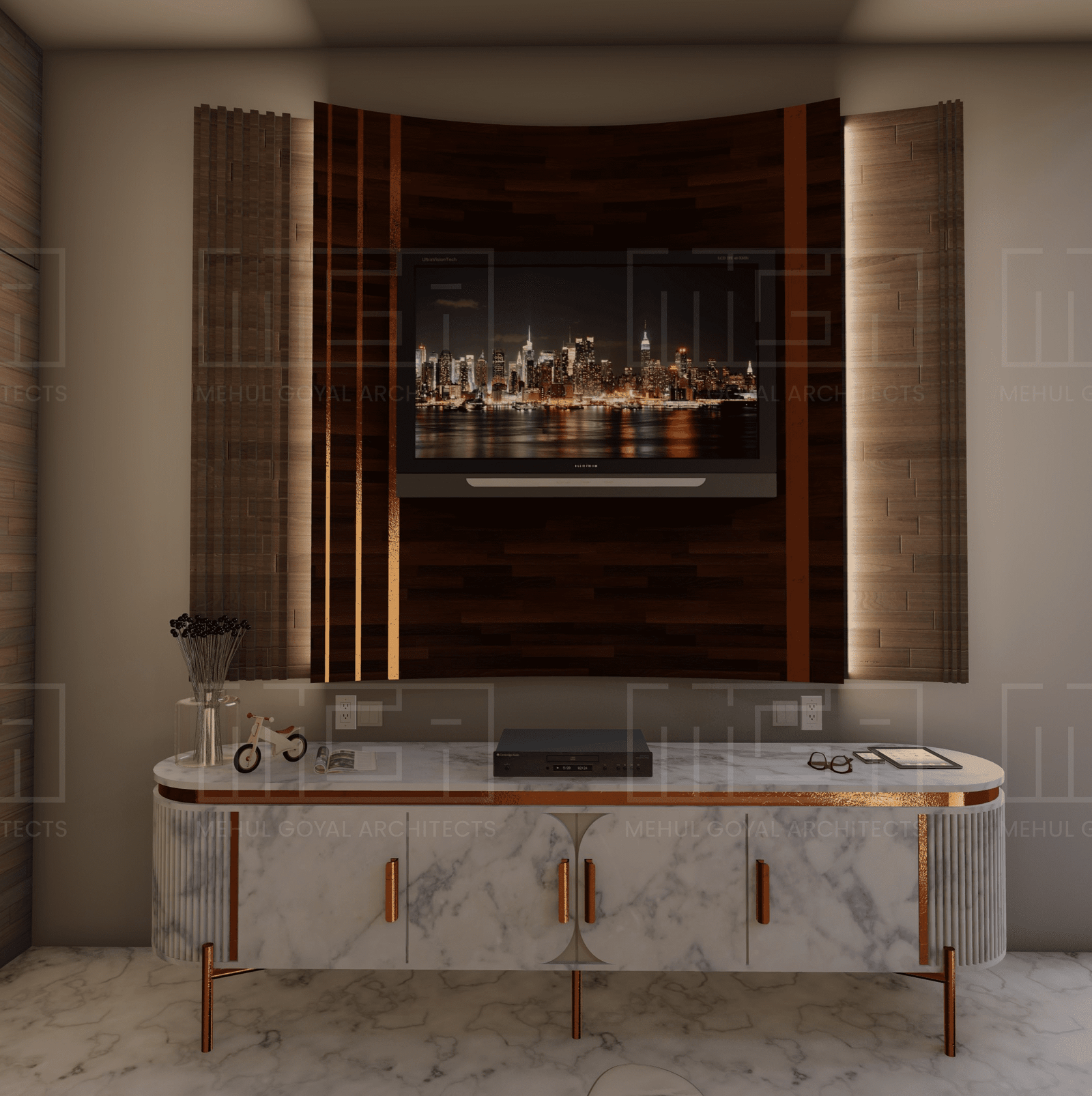Metallic stripes gracefully accentuate the contours, adding a bold, loud statement to the design. The unit is thoughtfully illuminated with cove lights, creating a cinematic ambiance that enhances your viewing experience. Complementing this, a rounded or curved-edged vanity or table completes the ensemble, harmonizing with the fluid lines and lavish aesthetic of the "CinéLuxe Console." Elevate your home entertainment with a touch of glamour and sophistication.